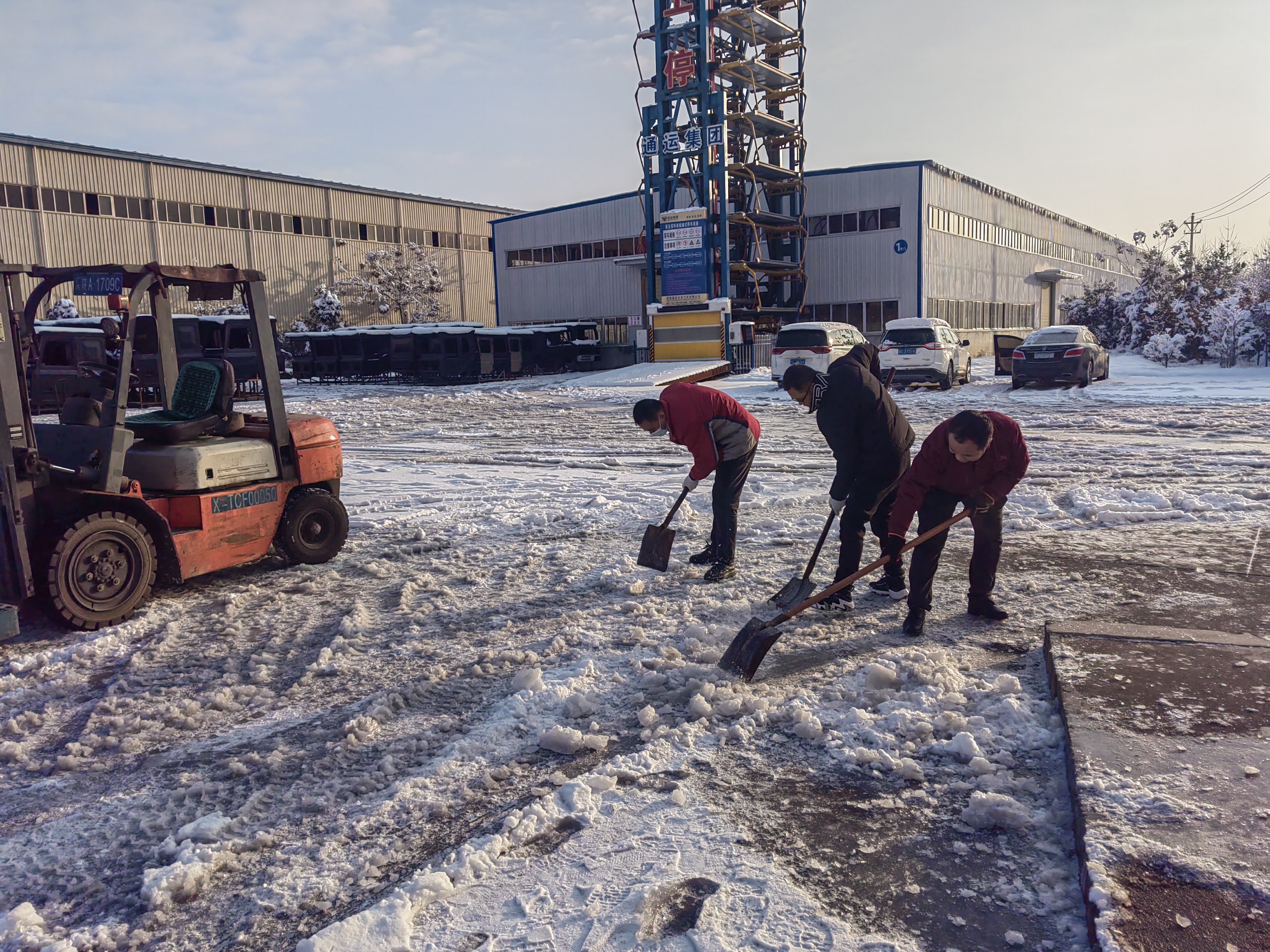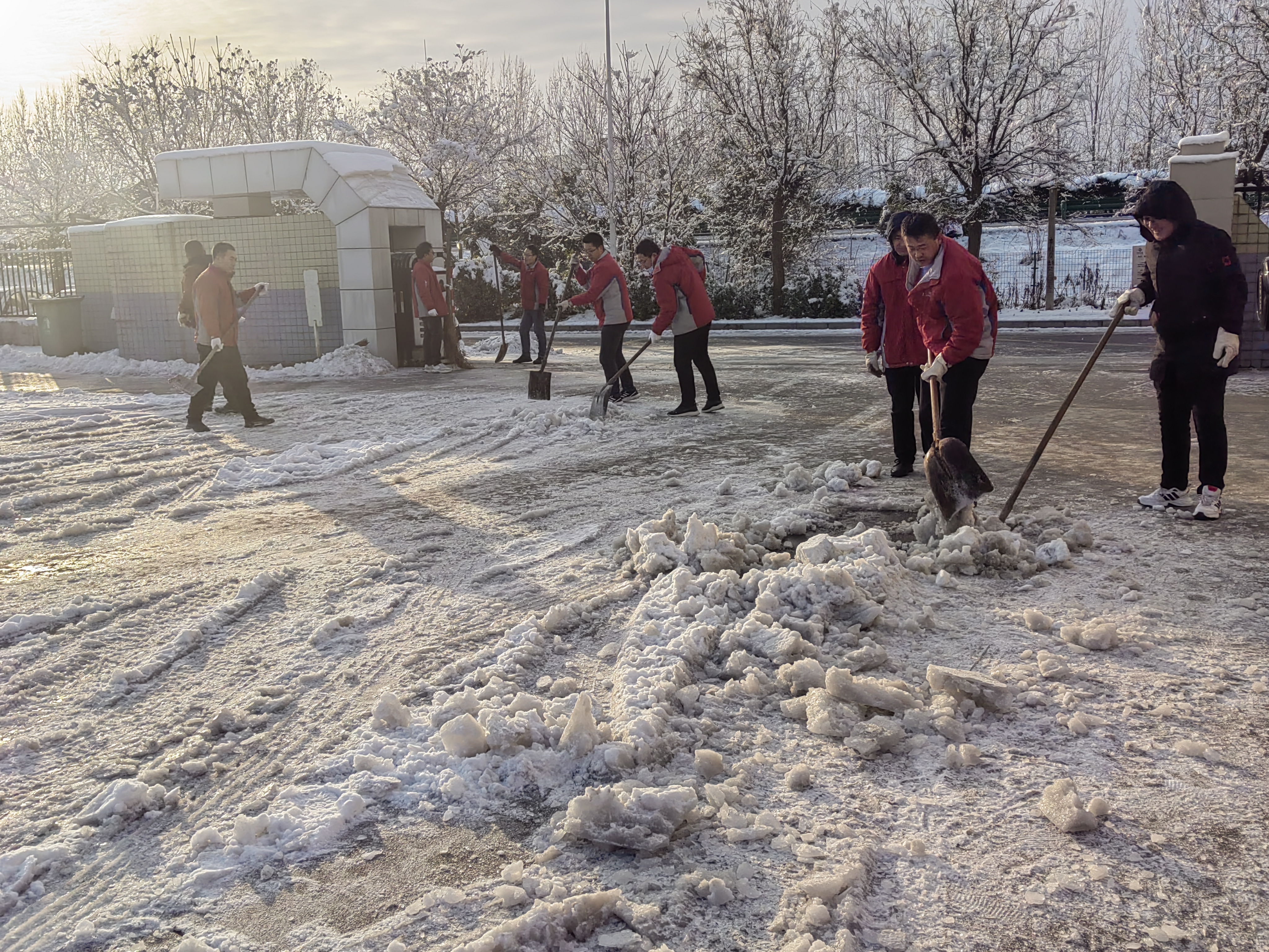 忽如一夜春風來,千樹萬樹梨花開。1月21日,迎來今冬以來的第一場降雪。人們在出門賞雪的同時,也感覺到腳下有些“出溜滑”。受晝夜溫差、車輛碾壓等原因,部分道路也開始積雪冰凍,給員工出行、物資運轉、產品運輸帶來了安全隱患。為了消除員工上下班安全隱患、確保安全生產,集團公司全體員工以實際行動吹響了清掃冰雪的“集結號”。