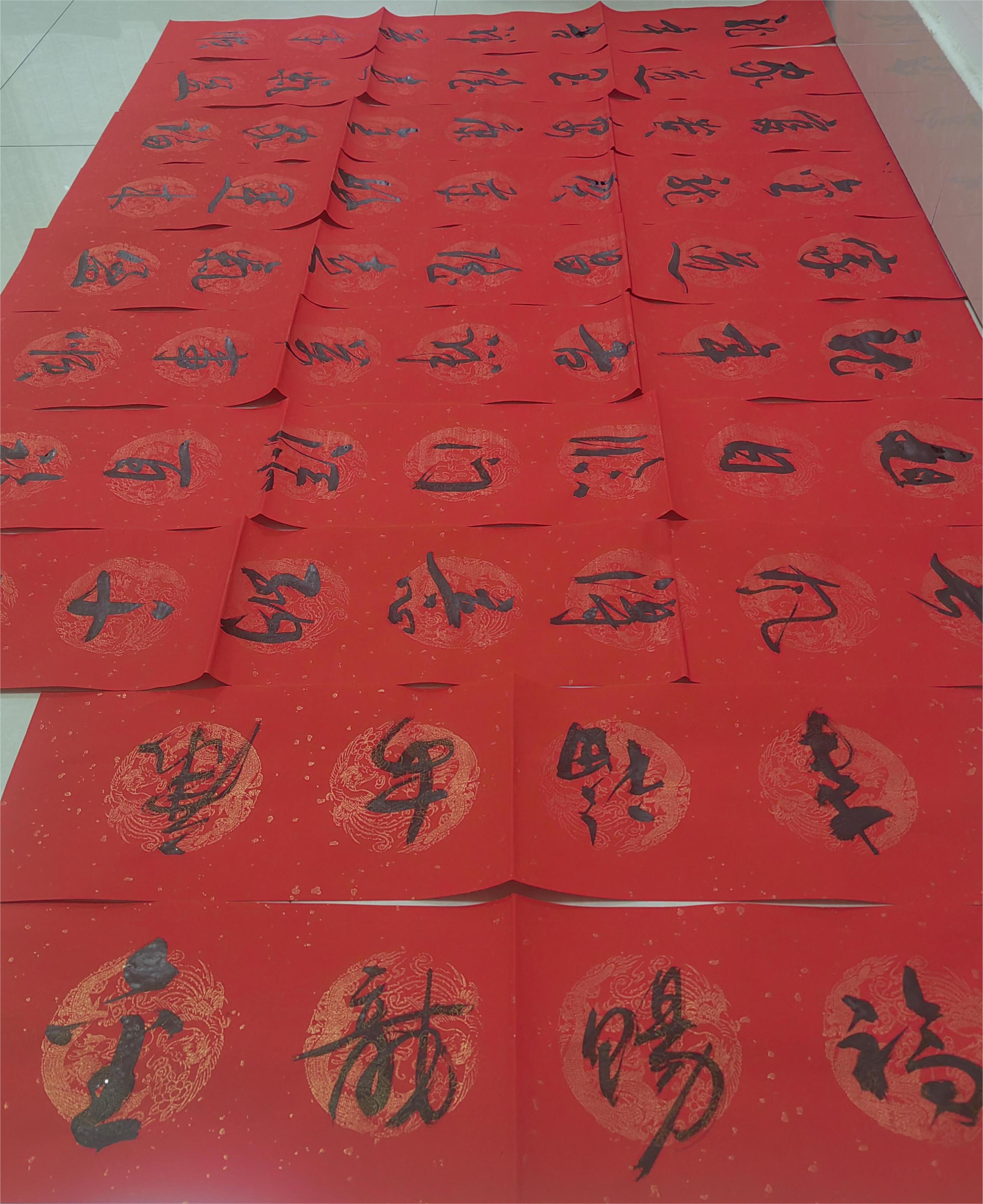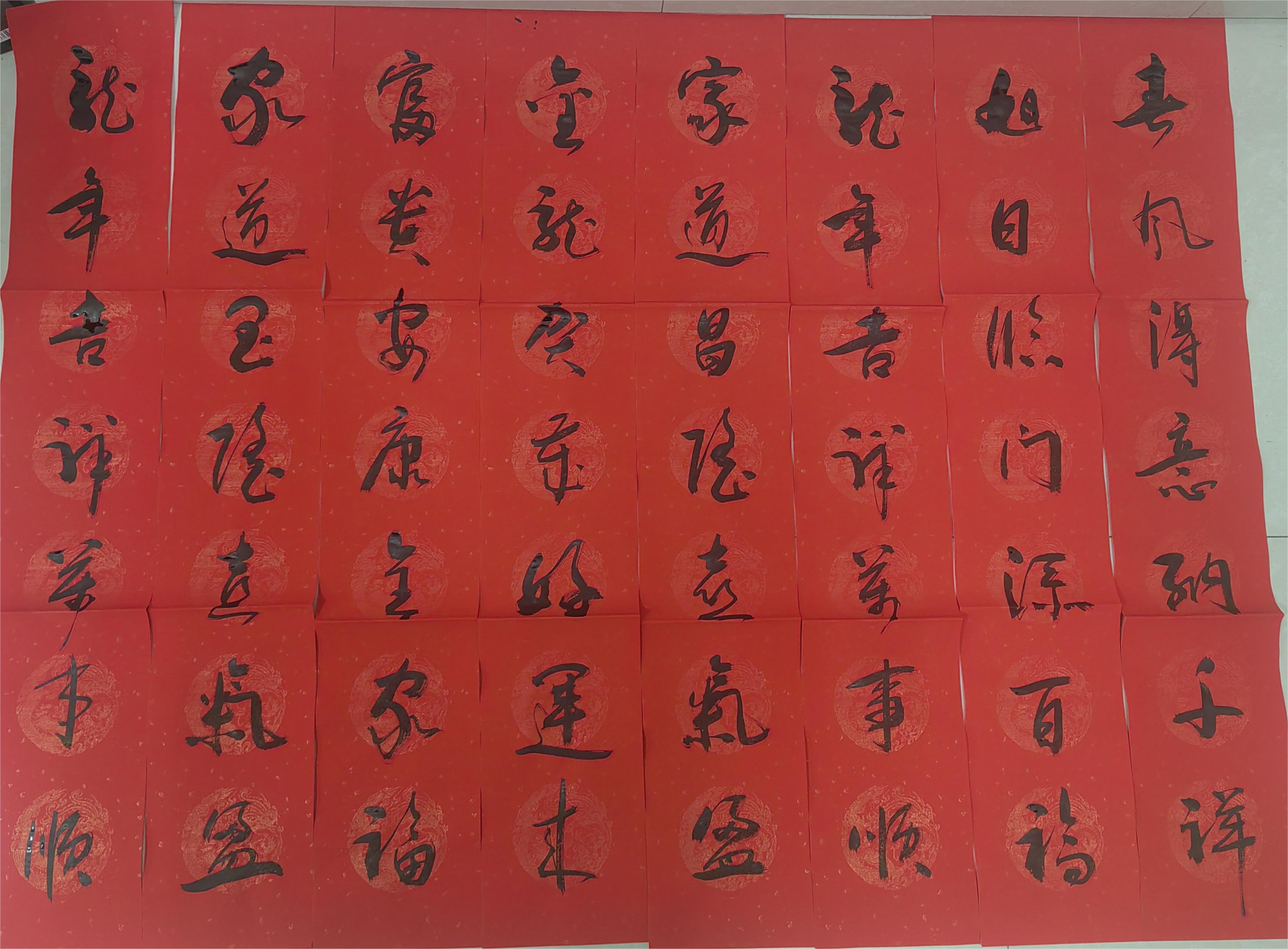 紅色宣紙悉數(shù)鋪開,為即將到來的新春佳節(jié)營造歡樂祥和的喜慶氛圍。劉老師執(zhí)筆揮毫,凝神聚氣,妙筆丹青,或婉約飄逸,或秀麗頎長,或方圓兼?zhèn)?,或剛勁有力,用不同的風(fēng)格揮寫相同的歡喜和年味,將美好的新春祝愿凝于筆端。
