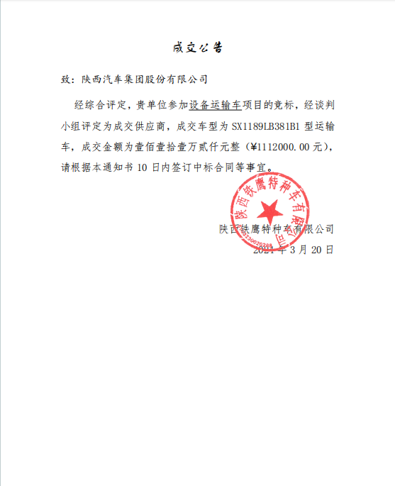 關(guān)于陜汽設(shè)備運(yùn)輸車的成交公告